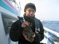 この日の状況は、朝から船長を悩ませた。朝の内は潮が吹っ飛んでおり、潮流と逆から強風が吹いていた。そのため、オマツリが続出。絶好のスタートを切ったものの釣果は思うように伸びなかった。仕方なく船長は、風に船をたてての釣りに変更した。 流し方変更後、私の横で釣っていた石合さんが連釣モードに突入、たて続けに4尾のホウボウを釣りあげた。しかし、時既に遅し、気が付けば沖上がりの正午を迎えていた。ホウボウは今が旬