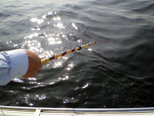 手バネでの釣りなら、合わせた後は道糸を手繰るので、船長は玉網を出すだけだが、リールを使った場合は、オモリの先に5m近いハリスがあり、自分で取り込むのは難しい。大型になると、海面近くに来て大暴れする魚もおり、釣り人が竿を離すのは危険だ。リール竿を使った場合は、取り込みは船長に任せた方がよい。