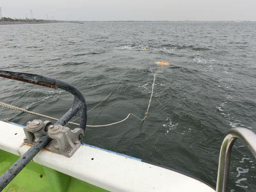 この日、舵を握った高橋広司船長が出船前、船上でビギナーにリールの操作や餌の付け方等をレクチャー。上乗り役の高橋郷さんが乗り込み、定刻の7時40分に総勢19人の釣り人を乗せて出船した。南東に進路を取って東京湾を横断。前方にアクアラインが、左後方には東京ベイブリッジやスカイツリーの姿が見える。アクアラインの橋を挟んで南北に広がる盤洲がこの日の釣り場。航程40分程で到着した。