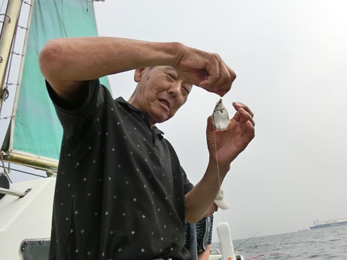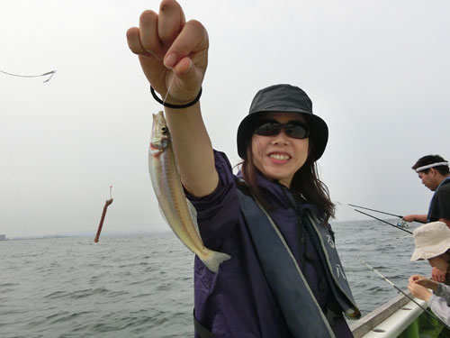 エンジンがスローになり、ミヨシ(船首)からシーアンカーが投入された。シーアンカーが潮に馴染むだところで「やって下さい。水深3m」と船長。左舷ミヨシの木村泰洋さんが、隣のビギナー鈴木智恵さんに餌を付けて釣り方を教えながら竿を出した。3番目は私。4番目以降は山崎陽子さん率いる5人組。会社の釣り同好会のメンバーとか。トモ(船尾)は鎌田憲行さん、トモから2番は船越一生さん。右舷にはミヨシにキス釣りが大好きと言う下村宏樹さん、2番目は他社の取材の方、3番目からは調稔也さんの会社の同僚5人組。トモは斉藤賢治さん。投入間もなく竿先を引き込んだのは銀色に輝くヒイラギ。トモでもミヨシでも胴の間(中央)でもヒイラギが舞う。たまに釣れるシロギスもピンギス(今年生まれた小型)ばかりで30分程で移動となった。