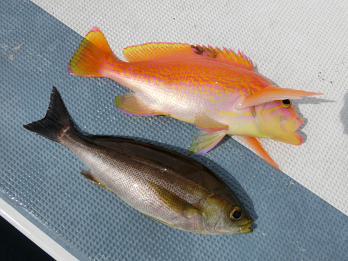 伊東市・宇佐美港『秀正丸』は伊豆諸島・新島、御蔵島周辺の遠征釣りを中心に出船している。午前2時30分には乗船者14人が集合、3時に出港した。ベットルームで仮眠を取り、6時過ぎに釣り場に到着。新島東沖の通称「新島ウラの瀬」のタナ55mでスタートした。間もなく30cmオーバーのイサキが釣れ出した。しかし、二枚潮の為、一斉投入の1回流し。投入が遅れたらその回はお休み、魚を上げたら次の投入の準備をして待機となる。オマツリを避ける為にはこの方法しかない。タナ50mから55mのポイントを釣り続け、イサキ、ロウソクチビキ、ムロアジ、アカイサキなどが釣れた。