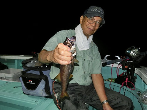 サバとの攻防を続けている内、薄暮に包まれ船中のライトが灯された。「来ましたよ」は左舷2番で竿を出していた上乗り役の島津眞二さん。見るとガクガクと竿先を引き込んでいる。褐色の魚体を取り込んだ。“本命”のムツだ。型は30cmオーバー。ライトに照らされた黒っぽい金色は時間と共に黒さが増し、褐色に近い黒となる。タナは底から1m位上だと言う。これを皮切りに右舷胴の間(中央)の小野成喜さん(平塚市)と室岡さんが33cmクラスを取り込む。船長から「喰いが立って来るとタナが7m位上まで上がってきますよ。タナを探って下さい」とアナウンス。