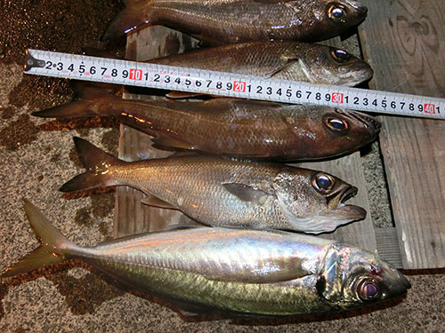周囲の暗さが一段と増してきて船の照明が眩しく感じられる。初めて釣りに連れて来てもらったと言う右舷トモ(船尾)の千葉恵子さん(伊勢原市)が30cmオーバーをぶら下げてニッコリ。隣で師匠格の川瀬さん(清川村)も良型を取り込む。ミヨシ(船首)の方でサバの魚体がキラリと光った。大竹さんと室岡さんが、船内備え付けのまな板を使って、釣ったばかりのサバを三枚に下ろし新鮮な餌作り。銀色に光る餌がムツを誘うのだ。新鮮な餌が効いたのか、室岡さんの竿がガクガク、グイーと引き込まれた。「ウ~ン、重い。付いてますよ」と言いながらリーリング。何と30cmから35cm級の4点掛けだ、隣の大竹さんも2点掛け。直後、小野さんの竿先が大きく引き込まれる、大型かと見ているとこちらは40cm超級のアジ。