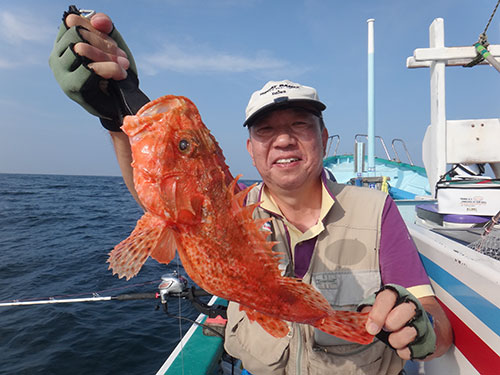 午前5時15分。定員6人を乗せ、静かに港を出る。肌に当る風も気持ちが良い。北山茂樹船長は、「昨日は潮が速くて良い釣りが出来なかった」と言い、前日とは違う南西に船を走らせた。「ここは1.5~2kgの大型が出る実績のある場所」と船長。「ハイ、いいですよ、水深は110m。150m位まで下っていきます」とのアナウンスでスタート。2本バリの仕掛けは、150号のオモリに引かれて行く。暫くすると、「今、120~125mです」と小まめに水深の変化を知らせてくれる。右舷ミヨシ(船首)の奥村嘉浩さん(大田区)がリールを巻き出した。覗くと魚が赤い。“本命”かと思ったが、上がって来たのはカンコ(ウッカリカサゴ)。オニカサゴでは無いが、まずはホッとして頬が緩む。