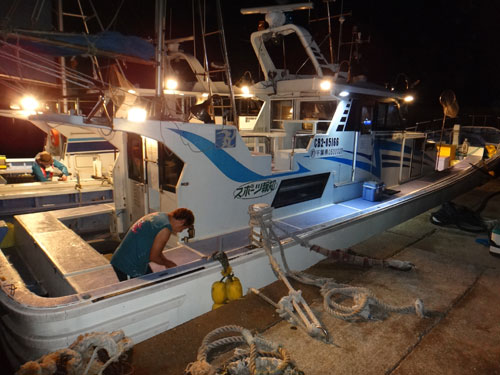 横浜から洲崎まではアクアラインと富津館山自動車道路を利用すれば約1時間半。今や楽々日帰りコースだ。以前は宿泊しないと来られなかったことを思うと隔世の感がある。房総フラワーライン沿いにある『早川丸』の待合所で受け付けを済ませ栄ノ浦港に向かう。まだ暗い午前4時30分に到着すると、既に船に照明が入り出船準備の真っ最中。係留してある2隻の内、スルメイカ船は5時頃、出港してしまった。カワハギの釣り人だけが後に残った。「カワハギのポイントは港の近くだから」との説明。