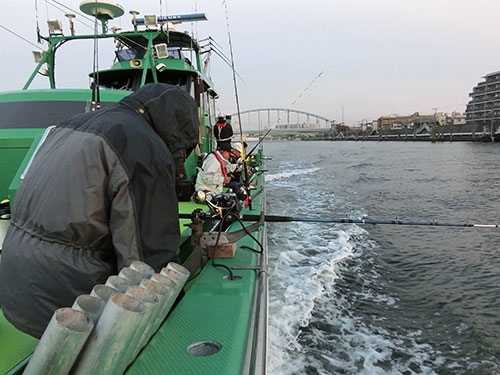 荷物を降ろそうとして「アッ!」、竿がない。何たる失態、家を出る時に玄関前に置いて積み忘れたのだ。釣り師失格である。恥を忍んで吉野眞太郎店主に竿を借りてのスタートとなった。空が白みかけた午前6時30分、藤田尚宏船長がエンジン音を一段と高くすると舫い綱が解かれた。左舷7人、右舷8人で釣り場の東京湾口を目指す。朝日に映える『東京ディズニーランド』を左手に、右前方に東京ゲートブリッジを見て約1時間30分の航程だ。