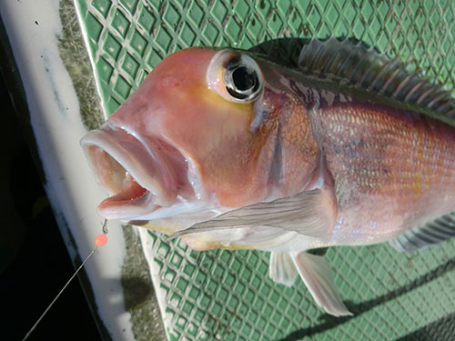 午後1時過ぎ、近くに“鳥山”が立ち、潮の流れが良くなって活性が上ったようでアマダイが連発、私もチャンス到来とばかりに餌を交換して投入。するとすぐにアマダイが釣れ、次はカサゴ2匹とトラギス1匹の3点掛け。次のアタリでアマダイを追加して竿を仕舞った。船中でもアマダイが順調に釣れ、竿頭は高梨さんの8匹、最大38cm。“外道”にはアカボラ、カサゴ、イトヨリ、マトウダイ等が釣れ、強風の悪条件の中としては、満足の釣果で定刻の午後2時に終了となった。