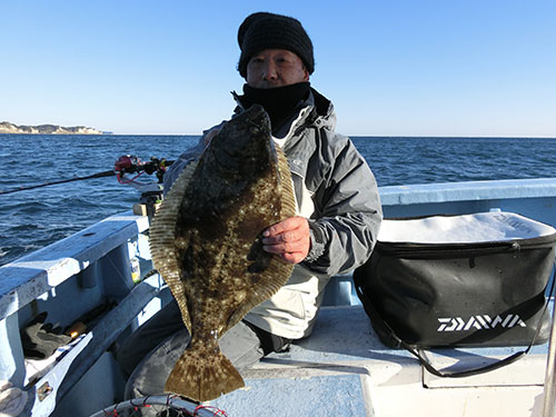 「今日は潮が少し澄んでいたが、イワシの反応もあり好調でした。今後、大型も期待できます」と船長。東風以外なら出船できるのが大原港の強み。脂の乗りも抜群、美味い“寒ビラメ”釣りは如何だろうか。
