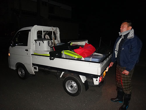 集合時間は、港に隣接した『松大丸』の駐車場に午前5時30分。5時15分頃に着いた。既に先着の車が駐車していた。軽トラックに荷物を積み込めば、船まで運んで貰える。竿は手に持ち係留船まで歩いて2、3分。私を含め、ヤリイカ釣りに魅せられた8人を乗せ、未だ真っ暗な午前6時、空に輝く三日月に照らされ出船した。