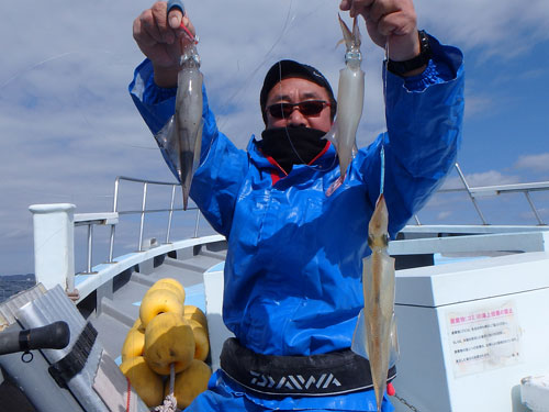 そのアドバイスをいち早く取り入れた右舷大ドモ(船尾)の松崎憲治さん(八千代市)が、なんといきなり5点掛け。そして次の投入では4点掛け。2投にして9杯だ。その様子を見ていた他の釣り人も、スッテを多めに入れた仕掛けに変更、もしくはプラヅノの一部をスッテに替えた。すると、突然、船中あちらこちらでヤリイカが乗り始めた。