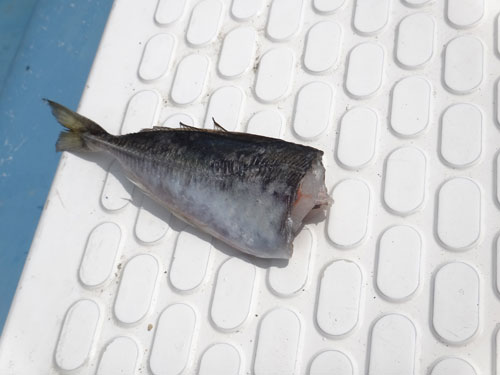 諦めずに再びアジを投入。3度目のアタリが来た。少しポイント移動しただけでこんなにアタリが多いのか?先程までが?のようだ。少し長めに待ってから寄せて来る。大きくはなさそう。「500g位かな?」と思いながら寄せてくる。今度こそバラすまいと、かなり近くまで寄せてからヤエンを入れた。さぁ、ここからが勝負。ラインを張ったり緩めたりすると、アオリイカの近くでヤエンが行ったり来たりする。今回はしっかり掛かった感触が伝わって来た。無事に取り込み、アオリイカGET。大型ではないが、貴重な1杯にほっと胸をなでおろした。 その後もアタリは続いたが、アジは食べられているがヤエンを投入すると離されたり、アジを少しかじり、寄せて来る間に離されたり、ヒットに持ち込めないまま“時合”終了。アタリもなくなり少し早めの午後1時に終了とした。