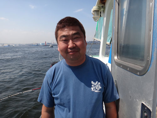 航程40分程で横浜沖。「ハイ着きました。始めて下さい。水深は20.5mです。下から2m前後でやって下さい」と、舵を握る野口勝弘船長からアナウンス。ベイブリッジ、ランドマークタワーが近くに見える。右舷胴の間(中央)の小森谷聡さん(久喜市)が、奥さんのしげみさんにコマセの撒き方などを丁寧に教えている。聞けば「LTアジは今回で3回目」との事。船中第1号は、左舷ミヨシ(船首)で、スポーツ新聞のAPCでもある小菅義弘さん(横浜市)が18cm前後のアジを取り込んだ。船長はすかさず「型が出ましたよ」とマイクで告げる。左舷トモ(船尾)寄りでもリールを巻き出した。勢いよく「エイッ」と抜き上げると、アジはハリから外れ、足元に転がった。次の投入でもアジを掛け、早くも2匹目が桶の中で泳いでいる。「連休中は余りパットしなかったが、今日は出だしから好調」と船長もホッと胸を撫で下ろす。小振り中心ながら、最初の流しから船内のあちらこちらで取り込んでいく。