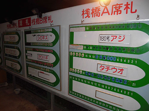 車の場合は、待合所入り口に立つスタッフの指示に従い駐車し、釣り座表のタグを取る。待合所の受付では、釣り物が書いてある札を受け取り、準備が出来たら待合所向かいの階段を上がり、釣り座表に表記されていた桟橋から船へ移動する。船長がタグと札を集めにきたら手渡すと言うのが、ここでの段取りだ。