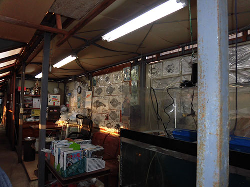 国道15号線の東大井『大井消防署』前を海側に入ると、直ぐ左側に『船宿 いわた』がある。待合室と船着き場は通りの先の行き止まりの堤防を越えた右手だ。6時30分前、待合室に3人の釣り人が岩田登行店長と釣り談義していた。壁には戦歴の魚拓がびっしり貼ってあり、71cmのマゴチの魚拓もある。釣り座は、先着順に荷物を置くシステムだ。「第一いわた丸」の船上では、船長の古高亘さんが4cm程のエビ(モエビ)を青い小バケツに配っていた。
