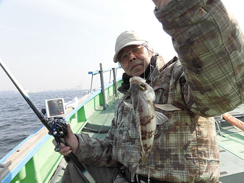 船長は次のポイント、鶴見沖に船を移動させた。ここは水深25m、つばさ橋の目の前だ。最初に釣り上げたのは左舷2番の石澤伸一さん(草加市)、銀隣が輝く魚体に刷毛で墨を散らした模様のメバルは20cm級のレギュラーサイズ。続いて右隣ミヨシ(船首)の阿部敏雄さん(港区)の竿が半月を描いた。「脊髄を痛めて腕が上がらないので、最近は小物釣りばかりだよ、キンメやアコウの深場はやれなくなったね」と言ながらもメバルを釣り上げた。この阿部さんは待合室に貼ってあるモンスターマゴチ71cmのレコードホルダーだ。3番の上野徹司さん(品川区)の竿を振わせたのは小振りなカサゴ。