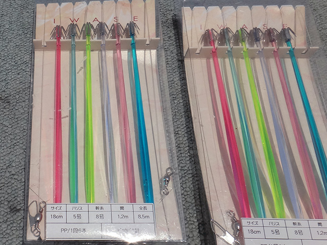 その割には、仕掛けに関してはそう神経質になる必要がないのが不思議。プラヅノはカラーが薄ブルー、濃いブルー、ケイムラなど青系一辺倒の組み合わせでも全く問題なく、よほど状況の悪い時でなければ薄ピンクや若草色は交ぜる必要はない。長さも14cm、18cmどちらでもOK。ただ、今後は大型が中心になってくるので全般に頑丈な(カンナ=針=が太軸など)18cmがお勧めだ。仕掛け方式は、どうしてもツノが縦になる直結式が有利だが、取り込みが不安というビギナーにはブランコ式もOK。今のところサバが少ないので、プラヅノを飲み込まれて、えらく苦労するという事態は少ない。「ただ、直結式もツノ数をそう多くする必要はないと思うんです。一般的には7~8本でよく、よほど自身がある人でも12~13本でいいのでは。潮回りして1投勝負ですぐ移動という釣りなら、多点ツノも有効かもしれませんが、南房ではあまりそういう釣りはしないので手返しを優先した方がいいです。今のところ、ブン流しの場合もかなりありますから」。