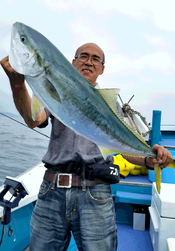 今年、和歌山ではカツオが久しぶりによく釣れ、カツオ狙いに走った船も多く、ポイントにあまり竿が入らなかったこともあるのではないかと思います。 ポイントの水深により魚のサイズはバラバラですが、カンパチの40㎝前後から50~58㎝、60~80㎝クラスも釣れだしています。また、ハマチ、メジロにまじってブリクラスも上がっています。“アンダーベイト”で釣れるのは青物だけではありません。マダイの60~65㎝も上がります。