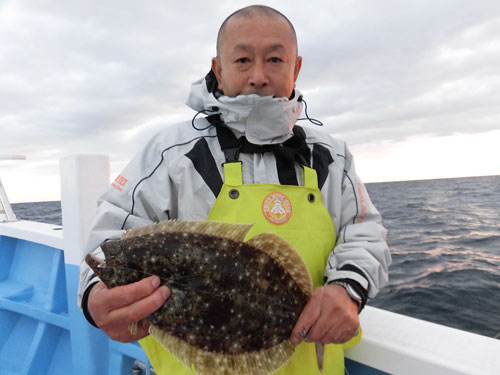 航行1時間弱で太東沖・大根に到着。餌のイワシが配られ、水深50mのポイントからスタート。それから僅か7分後、船中初ヒットは右舷ミヨシ(船首)の熊谷章さん(越谷市)。今季、『臼井丸』には早くも2回目の乗船とのことで、この日は幸先の良いスタートを切った。その後もポツリポツリと誰かの竿が曲がったが、このエリアはマトウダイが多かった。ヒラメもマトウダイも釣れるタナは一緒で釣り分けは至って困難。マトウダイの合間にヒラメが交じるというリズムがしばし続いた。