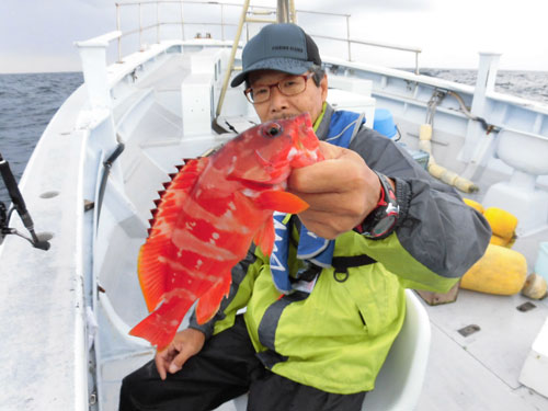 「今日は、潮の流れが速く、悪天候でしたが、ウネリの中まずまずでした。当分は水深30mまでを狙います。予約の際にテンヤか胴突きか言って下さい。両方持参でも結構です」と船長。好条件の日なら、クーラーは深紅の魚で一杯になるだろう。