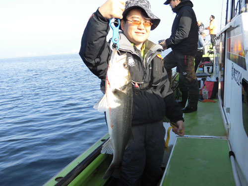 次なるポイントは船橋沖。水深はさらに浅くなり8m程。多くのアングラーが、ここでスピンテールジグを前方にキャストして、幅広くレンジを探る作戦に変更。流しのたびに次々とシーバスのアタリを拾っていく。辺り一帯にシーバスがいるのであろう。サイズも一回り、二回り大きくなり、フッコ級中心に釣れるようになってきた。ここで左舷後方の渡辺健次さんに大物のアタリ。タモに収まったそのサイズは70cm丁度のビッグワン。やはり大物はいる。船中は否がうえにも気合が入ってきた。