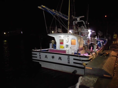 千葉県・外房地区は東京湾アクアラインの“値下げ”と圏央道との連絡で、首都圏からぐっと近くなった。ところが、取材日のカーナビには、強風のためアクアラインが時速40km規制になっているとの表示。予報でも北西の風が“赤マーク”となっていた。「これは港で船長に挨拶して出直すか」と思いつつ、東京湾トンネルを抜けアクアブリッジに出るとまさかの無風。電光掲示板には「風速14m」の文字が点滅しているが、さっきまでそんなに吹いていたのか。圏央道・市原鶴舞ICから御宿までは、のんびり向かっても1時間弱で到着する。港に着くと、これまた静穏なナギ模様。気象予報の精度はここ数年でかなりの的中率になったが、実態は現場に来てみないと分からないものだ。午前5時過ぎには釣り人たちの準備が整い、「太平丸」は定刻ちょっと前に出船した。