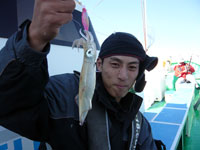 12月9日(木)朝6時、船宿に到着。しかし、船長から「今日は低気圧の影響で強風予報。午前中釣りができればって感じかな」といきなり先制パンチ。「まぁ、とりあえず行ってみましょう」と、気負いがないのがいい。私を含め6人と上乗り1人が乗って定刻通り7時に出船。釣り場はカメギ根周辺を攻めるとのこと。航程30分程。狙う水深は80m前後。この日は潮がブッ飛び、おまけに二枚潮という悪条件だった。「オモリは通常80号ですが100号があれば―」と、船長。イカの群れに仕掛けを当てようと何度も移動と微調整を繰り返すうち、左舷ミヨシ(船首)で1尾目がゲットされ、続いてもう1尾を追加、2尾のマルイカがタルに泳いだ。さらに他の釣り人2人にも1尾ずつ釣れ、船中4尾となったところで、予報通り南西の強風が吹き出し、瞬く間に大シケ状態。泣く泣く11時に早上がりとなった。結局、私は1度も竿を握れずマルイカ釣りの一切を理解できずに終了。翌日に再取材となった。