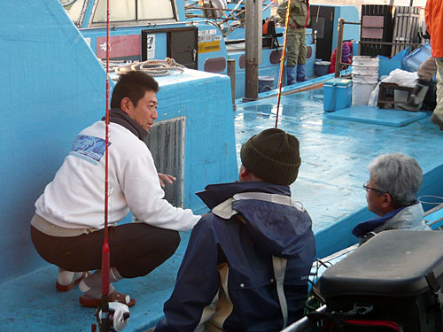 マダイ船担当は瀧本晃史(たきもと・こうじ)船長。誠実な人柄で「釣らせてくれる」船長だと常連さんが耳打ちしてくれた。早速貸し道具の人に釣り方のレクチャーをしていたが、その説明はとても丁寧でその評判にも納得。そんな船長に最近の状況を聞いてみた。「海の状況次第ですが、結構良いですよ」とのことで期待が膨らむ。マダイ船の釣り人は13人。定刻に出船した。
