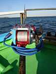 この日の釣り場は航程40分程の久里浜沖。水深は60m前後。釣り方はコマセ釣り。船内の釣り人が協力し一定のタナにコマセを撒いて魚を寄せるのが肝心だ。基本的な仕掛けは3、4号のフロロカーボンのハリス8m、餌は沖アミ。コマセカゴはLサイズの80号が標準。電動リールがあると便利だが、持っていない場合は、竿・電動リール・ロッドキーパーの一式が2,000円で借りられる。受け付け時に貸し道具希望と伝えておけばいい。