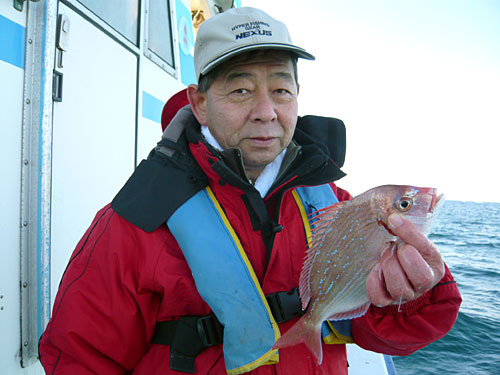 明けて8日(土)。この日は自分を含め7人が乗船。釣り場と釣り方は前日とほぼ同じ。ただし釣り人が多い分、コマセを撒く量と各人の戦略が多様になり、釣れる確率が上がっているはず。ここで船長に基本的なマダイの釣り方を改めて聞き、動画にまとめた。この日は前日と打って変わり、真冬とは思えない程に気温も上がり、途中で防寒着を脱ぐ程良い天気になった。しかし、前日とは逆に、開始から何もアタらない状況が続いた。8時丁度、群れが回ってきたのかバタバタとアジが釣れ、直後左舷胴の間(中央)の釣り人に300g級のハナダイがヒット。そして約1時間後に左舷ミヨシ(船首)の釣り人に強烈な引き込みでホウボウとマダイ(500g級)のダブル。しかもホウボウが上バリに掛かりマダイが下バリというおかしなハリ掛かりだった。その直後に左舷大ドモ(船尾)の釣り人にも同サイズのマダイが釣れた。前日と比べるとアタリの数は少なかったが明らかに型は良い。“当りダナ”を聞いてみると、ハリス8mを使い底から2mで当った、とのこと。