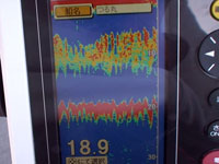 陽が高くなってからも潮が流れない状況に変わりはなかったが、松男船長の苦心の操船のお陰かポイントを移動する度に誰かしらにヒラメが上がる。その中で興味深いシーンがあった。水深18mで水面下3mくらいから15mくらいまで、イワシらしき反応がビッシリと魚探に出ている。松男船長から「記録(魚探反応)が真っ赤だよ」とアナウンスされる。「底ばっかり釣っている人は10mくらい仕掛けを持ち上げて落としてみて。イワシと一緒に泳いでいるヒラメもいると思うよ」。しばらくすると右舷トモ寄りで大きく竿が曲がった。「ほら、やっぱり餌を動かして気付かせてやると喰うよ」。上がってきたのは2㎏級の良型だった。それなら私もと、仕掛けを10m程巻上げ落とし直す。持参した探見丸でイワシの反応が出る度に試してみたが、やはり私の竿には置きっ放し状態でアタリが出る。ほぼベタ底のタナで釣れた魚は59㎝の良型マゴチ。大原沖のヒラメ釣りでは初めてお目にかかった。友人達の話では「唐揚げで最高だよ」との事。何とも贅沢な話である。