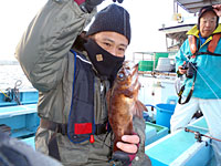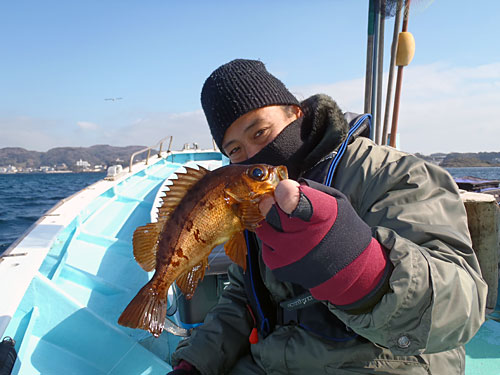 間もなく、「来ましたよ」と山本船長。左舷ミヨシで竿を出していた内藤悟さん(横浜市)の竿が大きな弧を描き、25㎝を超える立派なメバルが釣れて来た。暫くして、また内藤さんが同型のメバルを釣り上げ、続いて左舷側のもう一人にも20㎝級のメバルが釣れて来た。思わず右舷側に座った鈴木和美さん(横浜市)と顔を見合わせてしまった。この時点まで2人共、アタリらしきものすらなかったのだ。