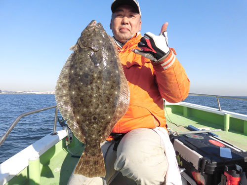 序盤は厳しい時間が続いたが、上げ潮に変わると魚の食いも上がって来た。魚群探知機の反応に比例するように船中でアジが同時ヒット。ここで左舷船首の菅澤哲一さんの竿先が明らかにアジとは異なる引き込み。細心の注意のドラグ調整で海面に顔を出したのは1kgオーバーのヒラメ。「今年は例年になくヒラメがコンスタントに顔を出す」と船長。この日も計4匹がアジの仕掛で取り込まれた。「ヒラメ40!とは言うけど、アジに食いつくヒラメは即食いだよ!」と船長。低くはない確率で期待出来る嬉しい“お年玉”だ。