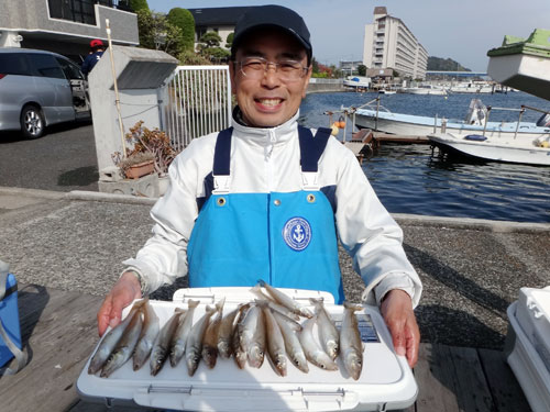 「はい!タナは底から1~2m位でやってみて」と船長から合図。水深は27m。しかし、アタリは全くない。船長はすぐに移動。そして3度目の小移動で活発なアタリを捕えた。船中でバタバタと中型アジが釣れ出した。水深は37m。「ちょっと深くて申し訳ないが…」と、船長としては不本意な水深のようだ。アジは適度な濁り潮が良く潮が澄むと極端に食いが悪くなる。この日の風(南西風10m)では、八景沖は澄み潮になってしまうので、深場に移動したと後で船長が明かしてくれた。その後もコンスタントに良型アジが釣れ続き、皆十分な“お土産”を確保した11時過ぎにアジ釣りは終了。後半のシロギス釣りに移行した。