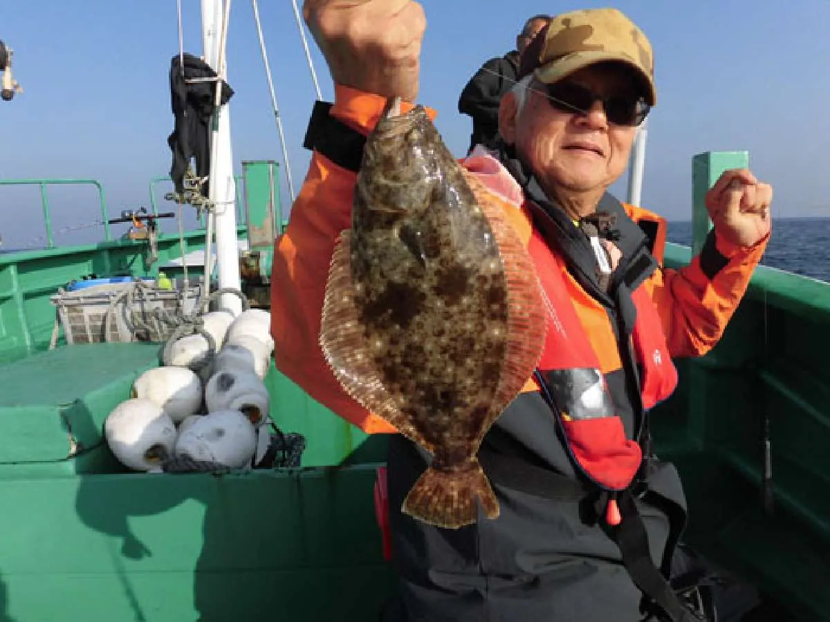「ん?なんだかアタリが遠い?」。海は結構濁っていた。穏やかでいい釣り日和だが、台風や大雨の影響がまだ残っているのか。2流し目、左舷胴の間(中央)の川口市・星野さんの竿が曲がった。竿を45度に立て慎重に巻き上げる。竿の粘りで海面まで浮かせ、上乗りの横田さんのタモ入れで2kg級を見事ゲット。今シーズンの初ヒラメは幸先の良いスタートとなった。4流し目、「水深15m」のアナウンス。浅場を攻める。左舷胴の間でイナダが上がり、右舷大ドモ(船尾)では、1kgオーバーのヒラメ。この人は、最終的に4匹ゲットしたつくば市の加茂さん。