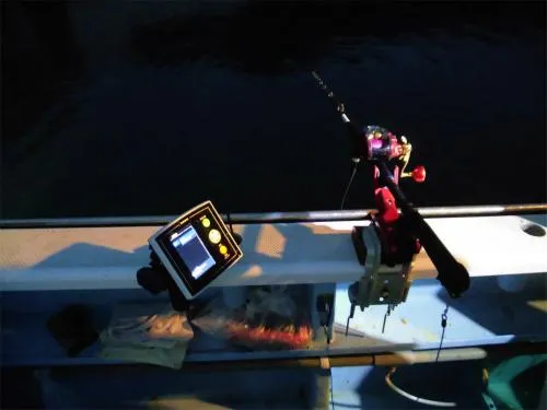 プラヅノは11~18cmのシングルカンナが推奨されている(18cmはスルメイカ用)。但し、クロスビーズの仕掛けや羽根付きオモリは使用禁止。船には電源設備完備。だが、釣り座によって遠い場合はバッテリーが借りられる。投入器は操舵室前の物入れに大量にストック。投入器を船縁に固定するゴムバンドも併せて借りる。この日は小雨交じりの天候、出船は6時過ぎだった。港を出ると、「40~50分走ります。オモリは150号を用意してください。キャビンの電気ポットや電子レンジはご自由にお使いください」と艫居(ともい)正悟船長からアナウンスがあり、「第一新盛丸」は南房総方面へと進んだ。