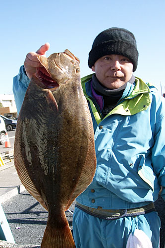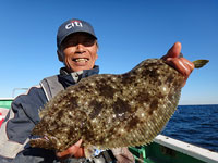 「はい、移動しま~す。ちょっと灘寄りに行きましょう」。周囲でヒラメを狙っている各船も喰いは悪いらしく、右往左往していた。そんな中、1kg超えが何尾か上がったと仲間の船からの情報で灘寄りの水深25mラインへ移動した。その直後、右舷大ドモ(船尾)で柔らかめのショートロッドが綺麗に弧を描いた。上がって来たのは1kg級のヒラメ。この人、漁礁周りで1度ヒラメらしきアタリを逃していただけに嬉しさも人一倍だったはず。間もなく、左舷大ドモでも何やら大はしゃぎ。「おー、スッゲー。いいな~、俺もまだヒラメ釣ったことないのに」。どうやらこの日が沖釣り初めての増山康介さんがヒラメを釣り上げたらしい。慌てて駆けつけるとこちらも堂々の1kgクラス。ヒラメの歯が怖いらしく、おっかなビックリでヒラメを持ち上げて記念撮影。