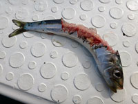 しかし、9時を回る頃にはピタッとアタリが止まってしまった。船長は水深23~33mの定置網周りへと船を移動させた。「この辺は根がきついから気をつけてね」。根がきついエリアでは基本的に竿は手持ちにして底からオモリを0.5~1m切っておこう。オモリトントンの状態で置き竿にしておくとすぐに根掛かりしてしまう。そして、移動してから10分後の事だった。右舷ミヨシ(船首)から2番目の比企野芳博さんの竿がグン、グングンと激しくお辞儀をした。これは大ビラメに違いない!そう思った瞬間、竿先が跳ね上がった。痛恨のスッポ抜け。上げられた仕掛けの餌はきれいに無くなっていた。
