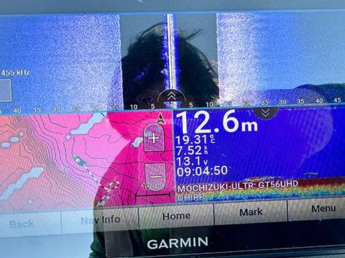 穏やかな湖面を東に走って、東岸のディープエリアへ。しかし、有望なスポットには先行者がいたので、まずは魚探を掛けて新しいスポットを探すことにした。水深12〜15mのブレイクを30分ほど魚探がけしたがなんの成果もなく、さらに北上した。