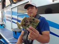 そして、9時を過ぎた頃、潮の流れが治まったということで、最初の釣り場に移動した。港の眼と鼻の先に戻った第一投でそれまでと違った強烈な引き込みで25cm近い良型のカハワギが釣れて来た。続いて23cm級と良型が連発、同乗者4人にも次々にカワハギが掛かり、船上は一気に活気付いた。しかし、やはり長続きはせず、再び“ゲスト”の連発になり、船長は近辺のポイントにマメに船を移動させながら、数を伸ばしていった。