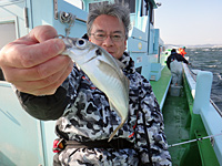 9時頃、私も竿を出した。風が段々強くなってきた。海上には“ウサギ”がとんで好条件とは言えないが、コマセを撒くとククッ、ククッと気持ちいいアタリ。1投目に取り込んだのは30cm級の良型シログチ。“ゲスト”扱いしてはバチが当たるサイズである。アジが釣れるか、シログチが釣れるか、これはこれで楽しい釣りになってきた。