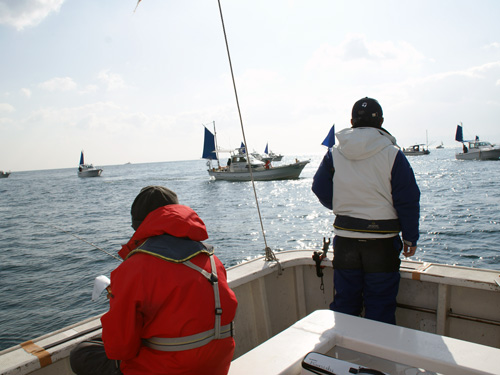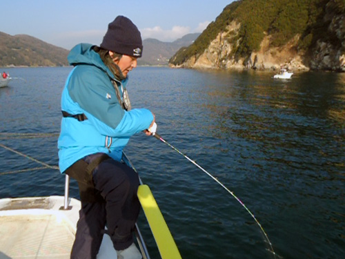 2~3月の条件がよい日には、アベレージサイズ30~40cmの美しいマダイを、よい人は20~30尾釣るというからこれはスゴイ! しかも、餌を一切使わないというのが横着者にはなんとも嬉しい。かじかんだ指でハリに餌を刺したり、コマセを詰めたりする手間も必要も全くないのだから(こんなに簡単に、魚の王様であるマダイが釣れちゃってエエの?って感じ)。