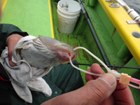 嫌な雰囲気を払拭したのが左舷ミヨシ(船首)の石井晴菜さん(ハルちゃん=船長や常連さんはそう呼ぶ)。第1号を取り込んだ。この後、連続でヒット。最初の1時間で5尾を釣り上げた。このペースで行くと……思わず頭の中に計算式がよぎる(5尾×7時間)。しかし、そうはいかない。マゴチは生息密度に濃淡があるらしい。釣れ始めるとあちこちで竿が曲がるが、その逆もある。釣り上げると各自、魚の顎に標識を付けて船中央にある「共用イケス」に入れて行く。魚が大き過ぎてバケツに入らないための工夫だ。