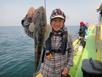 乗船者を見渡すと2本竿の人が多い。これは、船長が許可した「1本竿をマスターした人」のみに許されるそうだ。基本はあくまでも手持ちの1本竿との事。オモリは鋳込み天ビンもしくは船長推奨の三日月オモリ。15分程は誰の竿も曲がらない。「潮が流れないなぁ」と言う船長の独り言が耳に入る。すると左舷ミヨシ(船首)2番目の多賀さんの竿にゴツゴツとアタリがあった。しかし、魚が餌を放してしまう。直後に隣の方にも当たったが、これまたハリ掛かりせず。そんな時、右舷ミヨシ2番目の野口さんが竿を曲げた。船長がタモを持って駆け付ける。しかし、上がってきたのはイシモチ(シログチ)。本人も船長もガッカリ。中々“本命”の顔が見られない。