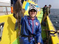 魚を掛けるといち早く船長が駆け付けタモ取りしてくれる。そのため船内4方向に大きなタモ網が配置されている。大型サイズが何尾か上がったが、圧巻は右舷ミヨシに座った小島さん。タモを持つ船長から「大きいぞ」の声。慎重にやり取りして上がってきたのは、ド肝を抜かれるモンスター級マゴチ(巻頭写真)。帰港後、計ると67cm。今シーズンの“タイレコード”だった。最終結果は、石井晴菜さんがトップで10尾、7尾が3人の2~10尾、船中50尾の大好漁となった。