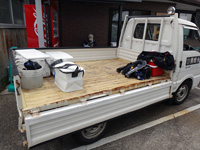 午前4時半前、待合所前に到着すると、山梨県から来たと言う常連の小林一彦さんが既に待っていた。「毎週来ているんですが、ここんとこ連敗中なんで今日こそは釣りたいですね」と気合い十分。雑談をしているとドアが開き、大船長が登場。午前便の釣り人は私を含め3人。右舷ミヨシ(船首)には一日通しで釣りをする常連さん、右舷大ドモ(船尾)には小林さん、私は左舷ミヨシの席に決めた。トラックの荷台に荷物を乗せ、道路を挟んだ久料港まで徒歩で移動。午前5時、準備が整い「第八魚磯丸」は久保田勝久若船長の舵取りで河岸払いとなった。