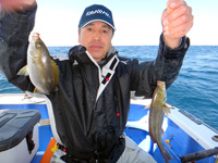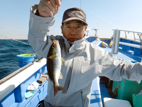 右舷側の胴の間に座った永田さんは、沖釣り“デビュー戦”。隣の新井さんから「タナは道糸の印で計るように」と指導を受け、指示タナでシャクる。「アタリが分からなかったけど魚は付いて来た」と言いながら人生初釣果に満面の笑み。沖上り間近、9尾まできたが「あと1尾」が中々釣れない。道具を片付ける人が出始める中、最後の最後に“ツ抜け(2桁)”を達成して、新井さんや船長にも喜びの報告。最終結果は10~54尾。船長の助手を務めた上野さんがトップだった。ちなみに私も途中から竿を出したが、トリプル交じりの15尾の釣果。