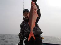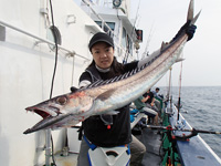 「どうぞ~、88m」。船長からの合図が出て一斉にジグが投入された。船長に状況を聞くと、まだマグロのような反応は出ていないとの事。上乗りの高橋敏さんが、「朝一の1投目に“本命”がヒットする確率が高い」と話していたが、船中誰もヒットせずにすぐ移動となった。2流し目、船中のファーストヒットは右舷胴の間に座った中村さん。ヒット直後、鋭い突っ込みを見せたが、“本命”とは違う引きのようだ。海面を割ったのは朱色のゲスト、ハチビキ。2kg弱の良型。それを皮切りに左舷の松田さんカップルにも仲良くハチビキがヒット。そして、その次の流しでは珍しいナガタチカマスも顔を見せた。「こんな魚、普段喰わないよ~。今日はよっぽど潮が暗いんだね。この魚は普通に釣れる魚だよ」。船長もこの日の状況に困惑気味。「潮も普段なら2、3ノット流れているのに、今は0.5ノット。参っちゃうね」。しかし、“本命”こそ顔を見せないもののハチビキの喰いは活発。左舷ミヨシ(船首)の井上康広さんは3連発。嬉しそうだが、3尾目にはヘトヘトになっていた。