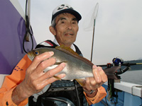 その流しで、宮崎さんは3連チャン。同サイズを3尾ゲット。しかし、ミヨシ(船首)側の釣り人2人が沈黙…何回か流しを変えて、登場したのはトゴットメバルが3本バリにパーフェクト。今度は右舷でも同じくダブル。これはこれで釣り人的には嬉しいのだが、それを見た船長がアドバイス。「メバルが釣れるって事はタナが低いって事ですからね。ここに来てまだ釣れていない人は自分のやっているタナを疑って下さいね。カウンターとかは間違っていることがありますからね。ちゃんと道糸を見て下さいね」。今度は一気に100m以上のドン深へ落ちるカケ上がりのポイントへ移動。27mで反応が出る。すると、今度は左舷大ドモの竿がグッと入った。小型だが“本命”のトリプル!そして、宮崎さんの竿にもアタリ。今度は追い食いに成功したようだ。35、30cm級のダブルで船内が湧いた。