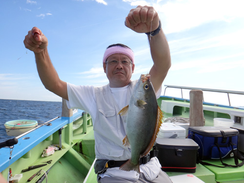 左舷トモの上條文雄さん(69歳)は強烈な竿の引込みを難無く交わし、42cmのビッグワンをタモですくった。聞けば今シーズン、イサキに5回も来ているとの事。「イサキは中層を一日中シャクリ続けるので難しい」とも言っていた。