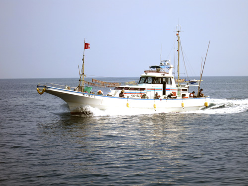 午前6時半、「ジャンボ船」は久保田忍船長の舵取りで定刻に河岸払い。小田原港名物“提燈灯台”を右手に見ながら船は初島方面へと舳先を向けた。滑走する船横からはトビウオが飛び、少し離れた場所ではイワシの群れを追うソウダガツオやシイラがジャンプ。海上は鏡のようなベタナギ。空は適度に曇り、釣果の良かった前々日と同じような好条件が揃った。「今年はスルメイカ、良いですね。5月から釣れていましたが、7月からは連日、トップは“規定数”ですもんね。ここ何年もここまで良い釣果が続く事が無かったですからね」と船長。「“アタリ年”ですか?」と質問すると、「ん~“アタリ年”って言うよりも“通常年”に戻ったと言う感じですかね」と言う。